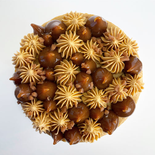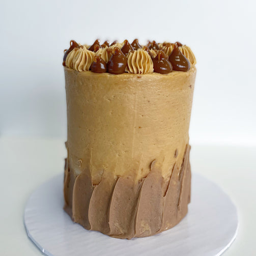 A vanilla cake filled with a caramel buttercream & skor bits. topped with dulce de leche & more caramel buttercream