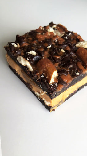 A rich chocolate brownie topped with pretzels, skor bits & chocolate.. filled with a salted caramel buttercream